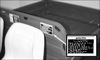 SafetyUnderstanding The Machine Safety LabelsThe machine safety labels shown in this section are placed in important areas on your machine to draw attention to potential safety hazards. On your machine safety labels, the words DANGER, WARNING, and CAUTION are used with this safety-alert symbol,. DANGER identifies the most serious hazards. The operator's manual also explains any potential safety hazards whenever necessary in special safety messages that are identified with the word, CAUTION, and the safety-alert symbol,. WARNING: RIDERS CAN FALL OFF AND BE KILLED· Maximum of one person to a seat. · No riders in box or anywhere else. WARNING: YOUNG DRIVERS INCREASE CHANCE OF DEATH· Young drivers may not be able to control vehicle. · No drivers younger than 16 years old. WARNING: ROLLOVER OR FALLING OFF MAY CAUSE DEATH· Drive very slowly when turning. · Always use brakes going down a slope. Vehicle can take-off (freewheel) downhill. · No loads heavier than 500 lbs (227 kg) in 4x2, 800 lbs (363 kg) in 6x4 and 1000 lbs (454 kg) in 6x4 DIESEL. Spread load evenly. Tie loads down. · Reduce speed and load on rough or hilly ground. CAUTIONDANGERSHIELD EYESEXPLOSIVE GASES can cause blindness or injury. NOSULFURIC ACIDCan cause blindness or severe burns. CAUTIONFlush eyes immediately with water. Get medical help fast. Keep out of reach of children. Keep vent caps tight and level. CAUTION: HELP PREVENT INJURY WHEN DUMPING LOADSNOTE: For machines with cargo box power lift option only. · Operate dump with machine stationary and parking brake locked: Never dump while moving. · Operate dump on level ground only. · Operate dump from operator's seat only. · Do not place hands behind seat when lowering box. · Refer to Operator's Manual for correct load distribution. Emission Control System Certification LabelNOTE: Tampering with emission controls and components by unauthorized personnel may result in severe fines or penalties. Emission controls and components can only be adjusted by EPA and/or CARB authorized service centers. Contact your John Deere Commercial and Consumer Equipment Retailer concerning emission controls and component questions. The presence of an emissions label signifies that the engine has been certified with the United States Environmental Protection Agency (EPA) and/or California Air Resources Board (CARB). The emissions warranty applies only to those engines marketed by John Deere that have been certified by the EPA and/or CARB; and used in the United States and Canada in off-road mobile equipment. Emission Compliance PeriodIf your engine has the emission compliance category listed on the emission control system certification or air index label, this indicates the number of operating hours for which the engine has been certified to meet EPA and/or CARB emission requirements. The following table provides the engine compliance period in hours associated with the category found on the certification label. Operating Safely· View the videotape provided with the vehicle for safe operating practices. · Do not misuse the utility vehicle. It is a utility vehicle, not a recreation vehicle. · The utility vehicle is not intended for use on highways or public roads. Do not operate vehicle on a road where the vehicle may be a hazard to faster-moving traffic. · Horseplay or recreational riding can lead to accidents, severe bodily injury or death. · Sit on the center of the seat and keep both feet within the foot platform perimeter. Clean foot platform if dirty, and remove any debris from around foot controls. · Check for debris in engine compartment, especially around brake linkage on each side of the transaxle. · Always use both hands for steering. · Know location of controls and how and what they operate. · Never operate utility vehicle while standing. · Never operate utility vehicle with the cargo box raised. · Check brake action before beginning vehicle operation. Adjust or service the brakes as necessary. · To provide adequate braking ability and traction, do not tow any attachment or loaded trailer unless the utility vehicle cargo box is fully loaded. · Inspect vehicle before operating. Be sure hardware is tight. Repair or replace damaged, badly worn, or missing parts. Be sure guards and shields are in good condition and fastened in place. Make any necessary adjustments before operating. · Keep people and pets out of the work area. Stop the vehicle if anyone enters the area. If an object is hit, stop and inspect the vehicle for damage. Make repairs before operating. · Do not leave vehicle unattended when it is running. · Only operate during daylight or with good artificial light. · Be careful of traffic when operating near or crossing roadways. · This vehicle is not intended for use on highways or public roadways. It is to be used for off-road use only. · Avoid sudden starts, stops, or turns. · Always use a level turn-around area. · Do not wear headphones while operating. Protect Children and Prevent Accidents· Never assume that children will remain where you last saw them. Stay alert to the presence of children. · Never carry children in the cargo box area. DO NOT let children ride in the cargo box of the utility vehicle or any attachment. DO NOT tow children in a cart or trailer. · Use extra care when coming to blind corners, shrubs, trees, or other objects that may block vision. · DO NOT let children or an untrained person operate the vehicle. · Before backing or turning, look behind and around the utility vehicle for children. · Be alert at all times, drive forward and in reverse carefully. People, especially children, can move quickly into an area of operation. · Back carefully. Look behind the vehicle, especially for children, before backing up. · DO NOT operate vehicle if under the influence of alcohol or other drugs. · Misuse and recreational riding can lead to accidents, severe bodily injury or death. Operator Training RequiredStudy operation 