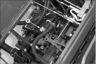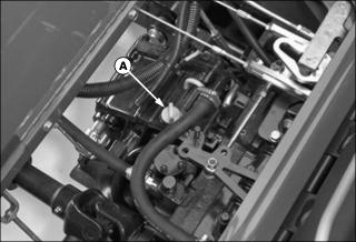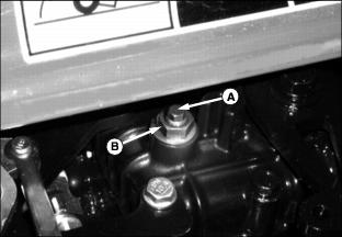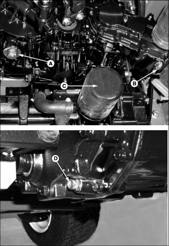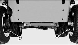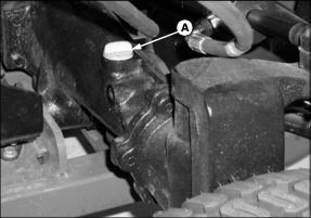 Checking the Transaxle Oil Level1. Park machine safely. (See Parking Safely in the Safety section.) 2. Open service hatch on operator's platform. 3. Locate the dipstick (A) on the top of the transaxle. 4. Unscrew the dipstick and wipe off with a clean shop towel. 5. Insert the dipstick fully into the transaxle housing and remove again. 6. Oil level should be in XXX range on dipstick. Add oil to transaxle if level does not show on dipstick. Remove oil if level is too high. 7. Install dipstick and close service hatch. If oil was added, check oil level after driving machine. Changing the Transaxle Oil and Filter1. Park machine safely. (See Parking Safely in the Safety section.) 2. Lower all attachments to the ground. 3. Place a drain pan under the transaxle. B - 4WD Housing Drain Plug (if equipped) 4. Clean away debris and remove drain plugs (A, B, and D) from locations shown above. Allow transaxle to drain. 5. Remove transaxle oil filter (C) and allow transaxle to drain. Clean oil filter mounting flange with a clean shop towel. 6. Lubricate the gasket of a new oil filter with few drops of transaxle oil, and install the filter onto the mounting flange. Tighten filter 1\2 to 3\4 of a turn after it contacts the flange. 8. Raise service hatch and remove transaxle oil filler cap (E). 9. Fill transaxle with recommended oil until level is up to top of XXX marks on dipstick. Dry transaxle capacity is listed below, but it may take less when performing an oil change. Do not overfill. 10. Run machine, cycling forward and reverse pedals to purge air from transaxle. Stop machine and recheck oil level. Adjusting Transaxle NeutralAdjust transmission neutral to assure that machine does not creep forward or rearward when pedals are in the neutral position. 1. Park machine on a firm, level surface. Place controls in following position: ˇ 4WD disengaged (if equipped). ˇ Differential lock disengaged. ˇ Attachment removed or service latch locked. ˇ Service hatch on operator's platform unlocked. 2. Chock rear tires and raise front of machine so front tires are off of ground. Place jack stands under left and right side of front axle and lower machine onto jack stands. 3. If 4WD option is installed, jack up rear of machine so tires are off of ground. Place jack stands under left and right side of rear axle and lower machine onto jack stands. 4. Start engine. Unlock the park brake. 5. Watch tires for forward or rearward rotation. 6. Cycle forward and reverse hydrostatic pedals and allow to them to return to the centered, neutral position. Check again for tire rotation while in neutral, indicating a neutral adjustment is necessary. 7. Open service hatch in operator's platform. Locate neutral adjuster screw (A) on top of transaxle. 9. Rotate screw until tires stop rotating. 10. Tighten lock nut. Cycle hydrostatic drive pedals and allow to return to neutral. Adjust screw again if necessary. 4WD Oilˇ John Deere GL-5 Gear Lubricant is recommended. ˇ Other oils may be used provided they meet the following specifications: Checking the 4WD Oil Level1. Open the engine cover and locate the rear axle filler cap and dipstick (A) on the right rear side of the rear axle. 2. Unscrew filler cap and wipe dipstick clean. 3. Install filler cap back into axle housing but do not turn threads back in. 4. Remove dipstick and check oil level on it. Oil should be in XXX area on dipstick but not above top mark. 5. Add oil if needed. Do not overfill. Changing the 4WD Oil1. Park machine safely. (See Parking Safely in the Safety section.) 2. Raise rear of machine so tires are off of ground, and support rear axle with jack stands. 3. Remove rear wheels from axle. 4. Place drain pan under center of rear axle housing and remove center drain plug (A). 6. Remove left side final drive housing drain plug (B), and allow to drain. 8. Repeat steps six and seven for right side housing (C). 9. Remove air bleed screw (D) from top of left and right side final drive gear case. 10. Fill rear axle housing with recommended oil until oil begins to run out of air bleed screws. Install air bleed screws and continue filling rear axle until 2.1 L (2-1/4 qt) of oil has been put in. Do not overfill. Check oil level with dipstick. Run machine in 4WD, and check oil level. |