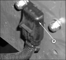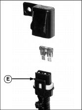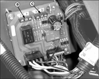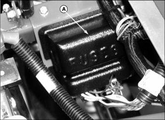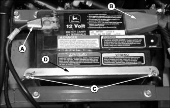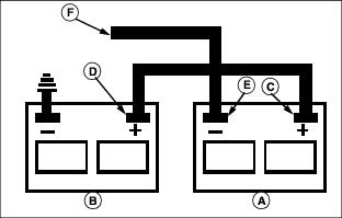 Checking Battery Electrolyte Level1. Remove battery manifold caps. 2. Check electrolyte level. Electrolyte level (B) should be 6 mm (1/4 in.) above plates (C) and below filler neck (D). 3. Add distilled water if necessary. Removing and Installing the BatteryRemoving:1. Park machine safely. (See Parking Safely in the Safety section.) 2. Raise the operator's seat platform. 3. Disconnect negative (-) battery cable (A). 4. Pull up red plastic cover (B) from positive (+) battery clamp and disconnect positive (+) cable clamp from battery post. 5. Remove wing nuts (C) from left and right side of battery hold down bracket (D). 6. Remove battery from machine. Do not use battery terminals to lift battery. Installing:1. Install battery with positive post (+) on right side of machine. 2. Install battery J-bolts, hold down bracket, and secure with wing nuts. 3. Install positive cable clamp (red cable) onto positive (+) battery post. Pull red plastic cover over positive cable clamp. 4. Install negative cable clamp (black cable) onto negative (-) battery post. 5. Lower operator's seat platform. Cleaning Battery and Terminals1. Disconnect and remove battery. 2. Wash battery with solution of four tablespoons of baking soda to one gallon of water. Be careful not to get the soda solution into the cells. 3. Rinse the battery with plain water and dry. 4. Clean terminals and battery cable ends with wire brush until bright. 6. Attach cable clamps to battery posts. 7. Apply petroleum jelly or silicone spray to terminal to prevent corrosion. Using Booster Battery1. Connect positive (+) booster cable to booster battery (A) positive (+) post (C). 2. Connect the other end of positive (+) booster cable to the disabled vehicle battery (B) positive (+) post (D). 3. Connect negative (-) booster cable to booster battery negative (-) post (E). 4. Connect the other end (F) of negative (-) booster cable to a metal part of the disabled machine frame away from battery. 5. Start the engine of the disabled machine and run machine for several minutes. 6. Carefully disconnect the booster cables in the exact reverse order: negative cable first and then the positive cable. Checking and Replacing FusesMain Fuse Replacement2. Locate the electrical control box (A) on the right side of the engine compartment. 3. Remove cover (A) from panel. 4. Fuse (B) is a 15 amp fuse and controls all lights on the machine. 5. Fuse (C) is a 15 amp fuse and controls all other electrical functions 6. Test fuses with voltmeter or test lamp and replace if burned out. Radiator Fan Fuse Replacement1. Park machine safely. (See Parking Safely in the Safety section.) 3. Locate the radiator fan fuse (D) on the right side of engine compartment. 4. Pull out lock tab (E) and pull base of fuse holder down from cap. 5. Test fuse using a voltmeter or test lamp. Both sides of fuse should be hot (even with key switch in off position). |