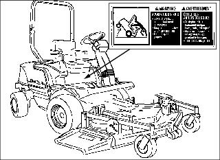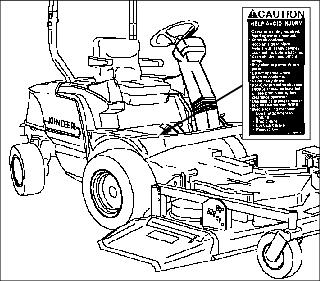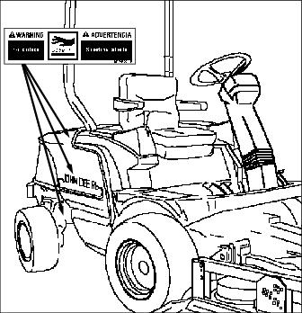SafetyUnderstanding the Machine Safety LabelsThe machine safety labels shown in this section are placed in important areas on your machine to draw attention to potential safety hazards. On your machine safety labels, the words DANGER, WARNING, and CAUTION are used with this safety-alert symbol,. DANGER identifies the most serious hazards. The operator's manual also explains any potential safety hazards whenever necessary in special safety messages that are identified with the word, CAUTION, and the safety-alert symbol,. WARNINGCAUTIONˇ Keep children and others away ˇ Stay clear of power driven parts ˇ Do not operate where machine could tip ˇ Roll-over protection structure (ROPS) should be raised unless prohibited by low clearance operation ˇ Use seat belts unless ROPS is in lowered position WARNINGˇ Move very slowly when attachment is removed ˇ Keep attachment low when transporting WARNINGˇ Keep Rollover Protective Structure fully extended CAUTIONTO MAINTAIN STEERING CONTROL AND STABILITY See operator's manual for ballasting recommendations ROLL-OVER PROTECTIVE STRUCTURETo maintain operator protection and ROPS certification: ˇ Replace damaged ROPS, do not repair or revise ˇ Any alteration of ROPS must be approved by manufacturer CERTIFICATIONPerformance certified at date of manufacture to: Two Post ROPS - OSHA: 29 CFR, Part 1928, Subpart C John Deere Mowers, 1400 Series Deere & Company, Moline, Illinois, U.S.A. Emissions Control System Certification Label (NonRoad Diesel)The emissions warranty described in the warranty section applies only to those engines marketed by John Deere that have been certified by the United States Environmental Protection Agency (EPA) and/or California Air Resources Board (CARB); and used in the United States in non-road mobile (self-propelled or portable/transportable) equipment which is moved at least once every 12 months. The presence of an emissions label like the one shown signifies that the engine has been certified with the EPA and/or CARB. The EPA and CARB warranties only apply to new engines having the certification label affixed to the engine and sold as stated above in the geographic areas governed by the regulating agencies. NOTE: The hp/kW rating on the engine emissions certification label specifies the gross engine hp/kW, which is flywheel power without fan. In most applications this will not be the same rating as the advertised vehicle hp/kW rating. Emission Control System Certification Label (Small Off-Road Gas Engines)NOTE: Tampering with emission controls and components by unauthorized personnel may result in severe fines or penalties. Emission controls and components can only be adjusted by EPA and/or CARB authorized service centers. Contact your John Deere Commercial and Consumer Equipment Retailer concerning emission controls and component questions. The presence of an emissions label signifies that the engine has been certified with the United States Environmental Protection Agency (EPA) and/or California Air Resources Board (CARB). The emissions warranty applies only to those engines marketed by John Deere that have been certified by the EPA and/or CARB; and used in the United States and Canada in off-road mobile equipment. Emission Compliance Period (Small Off-Road Gas Engines)If your engine has the emission compliance category listed on the emission control system certification or air index label, this indicates the number of operating hours for which the engine has been certified to meet EPA and/or CARB emission requirements. The following table provides the engine compliance period in hours associated with the category found on the certification label. Certification LabelThis model has been tested and evaluated by the manufacturer and conforms to American National Standard Institute B-71.4 safety specifications for commercial turf care equipment as a ride-on turf tractor with approved attachments. Operator Training Requiredˇ The owner of the machine is responsible for training the users and mechanics of the machine. ˇ The owner/user can prevent and is responsible for accidents or injuries occurring to themselves, other people, or property. ˇ Do not allow operation or service of the machine by children or untrained adults. ˇ Read the operator's manual and study the safety and operation sections before operating the machine. ˇ If the operator of the machine cannot read or understand this manual, it is the machine's owner responsibility to explain this material to the operator. This publication is available in other languages. ˇ Operate the machine in an open, unobstructed area under the direction of an experienced operator. ˇ Learn the use of all controls. ˇ Operator experience is required to learn the moving, stopping, turning and other operating characteristics of the machine. Wear Appropriate Clothingˇ Wear close fitting clothing and safety equipment appropriate for the job. ˇ Always wear safety goggles or safety glasses with side shields when operating the mower ˇ Wear a suitable protective device such as earplugs. Loud noise can cause impairment or loss of hearing. ˇ Do not wear radio or music headphones. Safe service and operation requires your full attention. Operating Safelyˇ Inspect machine before you operate. Be sure hardware is tight. Repair or replace damaged, badly worn, or missing parts. Be sure guards and shields are in good condition and fastened in place. Make any necessary adjustments before you operate. ˇ Check before each use that operator presence controls are functioning correctly. Test safety systems. Do not operate unless they are functioning correctly. ˇ Do not change the engine governor setting or overspeed the engine. ˇ Always wear seat belt if machine has a standard ROPS or a folding ROPS in the upright position. ˇ Check brake action before you operate. Adjust or service brakes as necessary. ˇ Stop machine if anyone enters the area. ˇ Never raise mower decks when blades are runnin